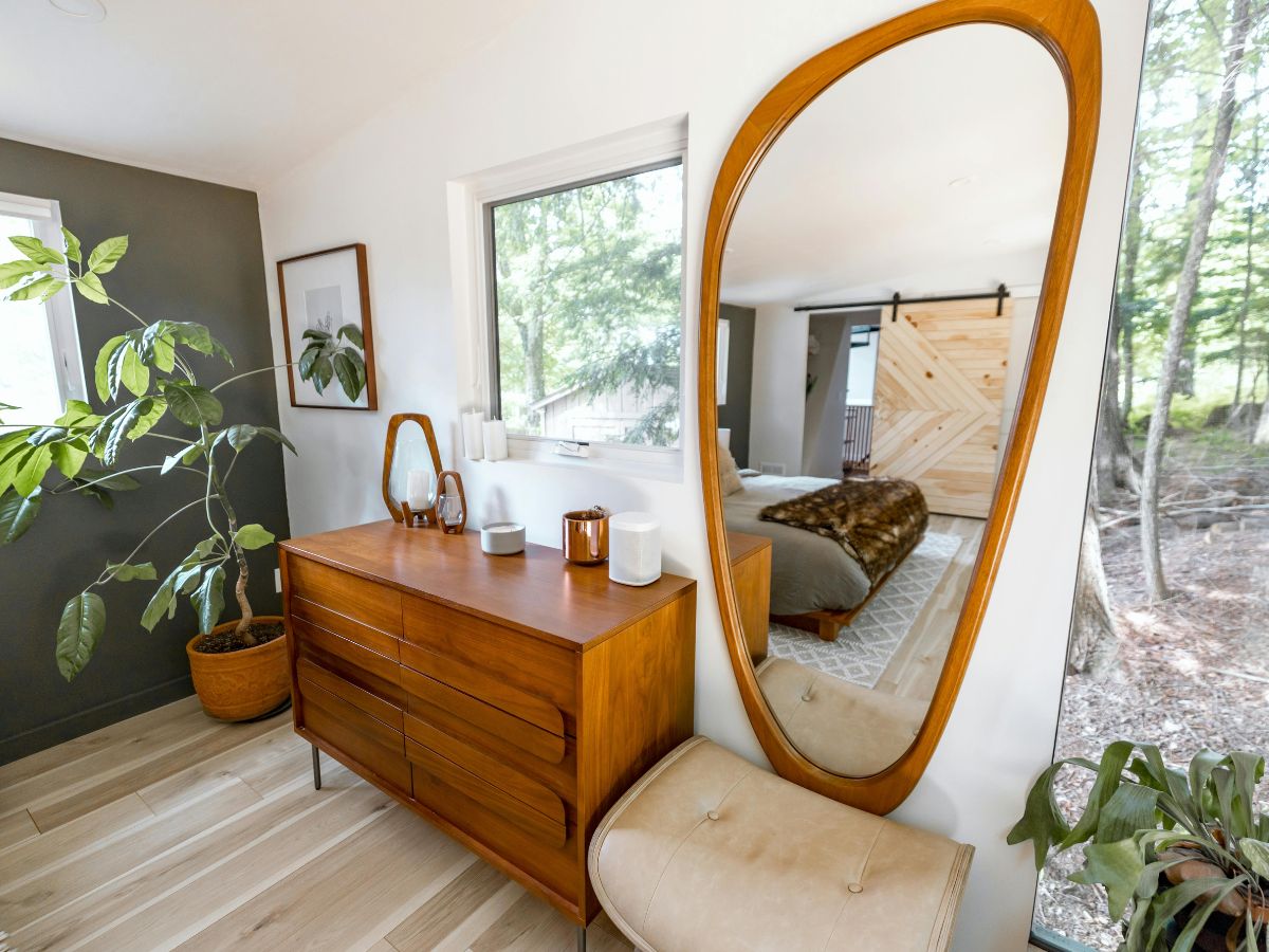 Framed mirrors don’t have to be plain. Layered wood, rattan, or mixed-metal frames introduce dimension and craftsmanship. A custom-sized rectangular mirror with a wide oak or walnut frame can complement natural finishes and bring warmth to minimalist spaces.